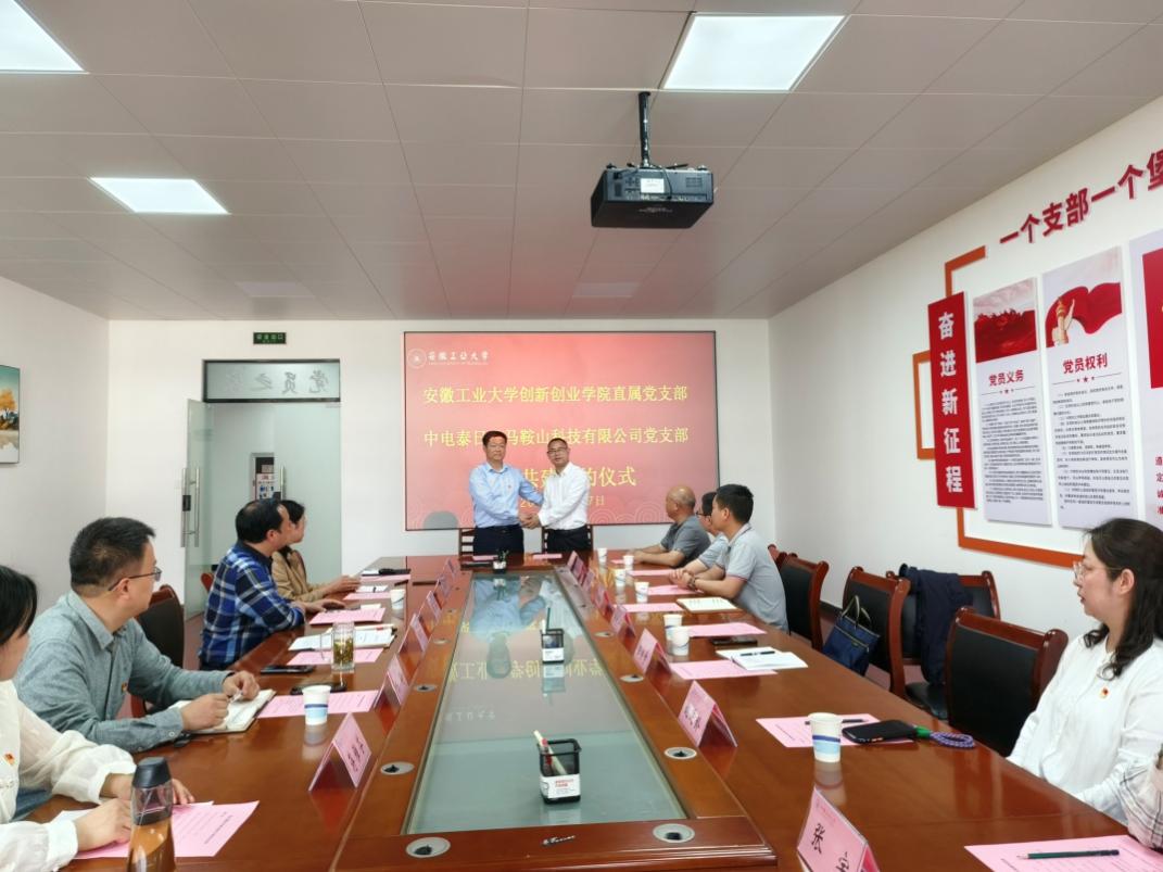 4月27日,beet365直属党支部与中电泰日升马鞍山科技有限公司党支部开展“联学共建促产教融合发展”主题党日活动暨院企党建结对共建签约仪式在秀山校区创新A楼309会议室举行。beet365直属党支部书记、经理黄仙山,中电泰日升马鞍山科技有限公司党支部书记、总经理余长兴,马鞍山市慈湖高新区专职党建指导员汪家贵,以及双方党员代表参加本次活动。