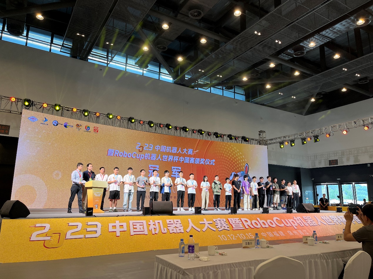 10月13日至15日,2023中国机器人大赛暨RoboCup机器人世界杯中国赛在福建晋江举行。公司计算机公司程泽凯老师指导,刘超、张亮、淡大波等同学参加的YuShan机器人足球队参加仿真2D组比赛。YuShan队不畏强手,一路拼搏,在决赛中险胜东北大学Alkaid队,最终获冠军。在近11年中,实现该项赛事“六冠四亚一季”。此外,公司代表队获得技术挑战赛中获得第一名。