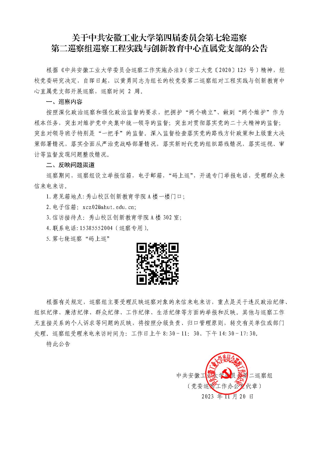 关于中共beet365官方网站第四届委员会第七轮巡察第二巡察组巡察工程实践与创新教育中心直属党支部的公告